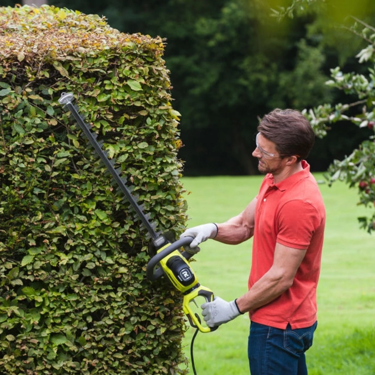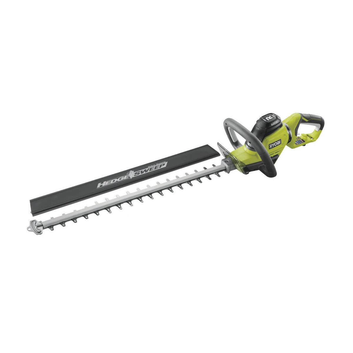 Cortasetos Ryobi de 600 W con cuchillas de 60 cm y capacidad de corte de 28 mm. Ergonomía y precisión para podar setos.