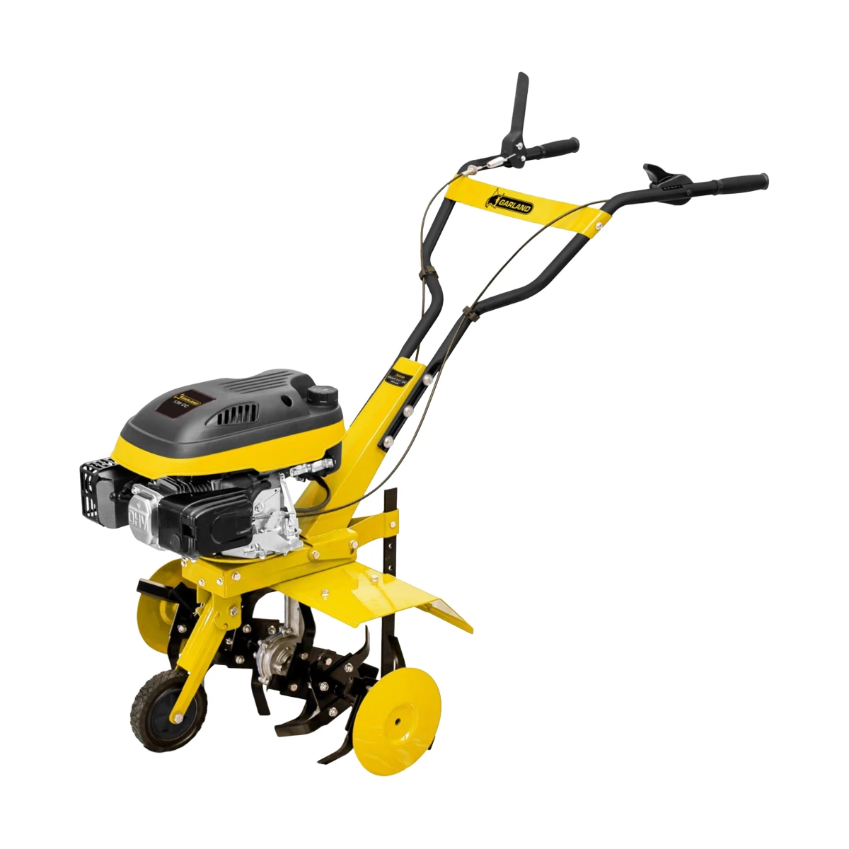 La motoazada Garland es una herramienta robusta para preparar el terreno en huertos y jardines. Dispone de un motor de gasolina de 4 tiempos y una transmisión por cadena que mueve un juego de fresas con un ancho ajustable entre 32 y 60 cm. La profundidad de trabajo alcanza aproximadamente 20 cm y el manillar ajustable mejora la ergonomía. Incluye ruedas de transporte para moverla fácilmente y un robusto protector delantero.