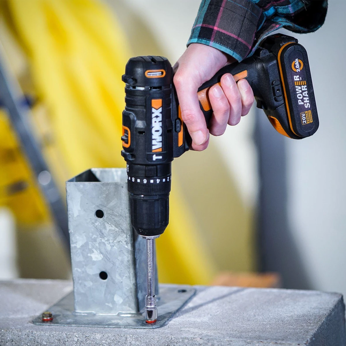 Taladro percutor a batería de 20 V con par de 60 Nm y 2 velocidades. Ideal para taladrar y atornillar sin cables en madera, metal y mampostería.